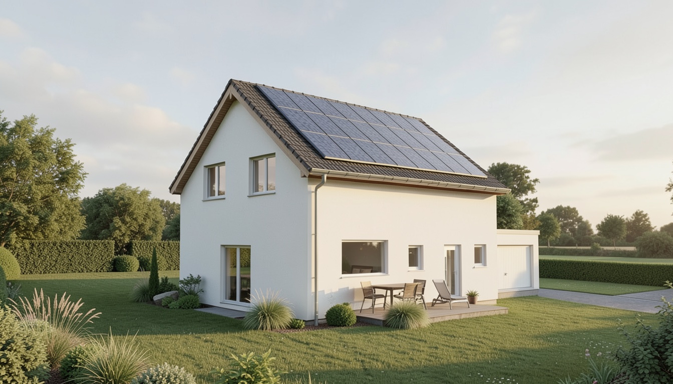 Das Haus zeigt eine klare, moderne Architektur mit heller Fassade, integrierten Solarmodulen auf dem Dach und einem sorgfältig gestalteten Außenbereich. Große Fensterflächen verbinden Innen- und Außenraum auf natürliche Weise – ein Zuhause, das Nachhaltigkeit und Wohnqualität vereint.