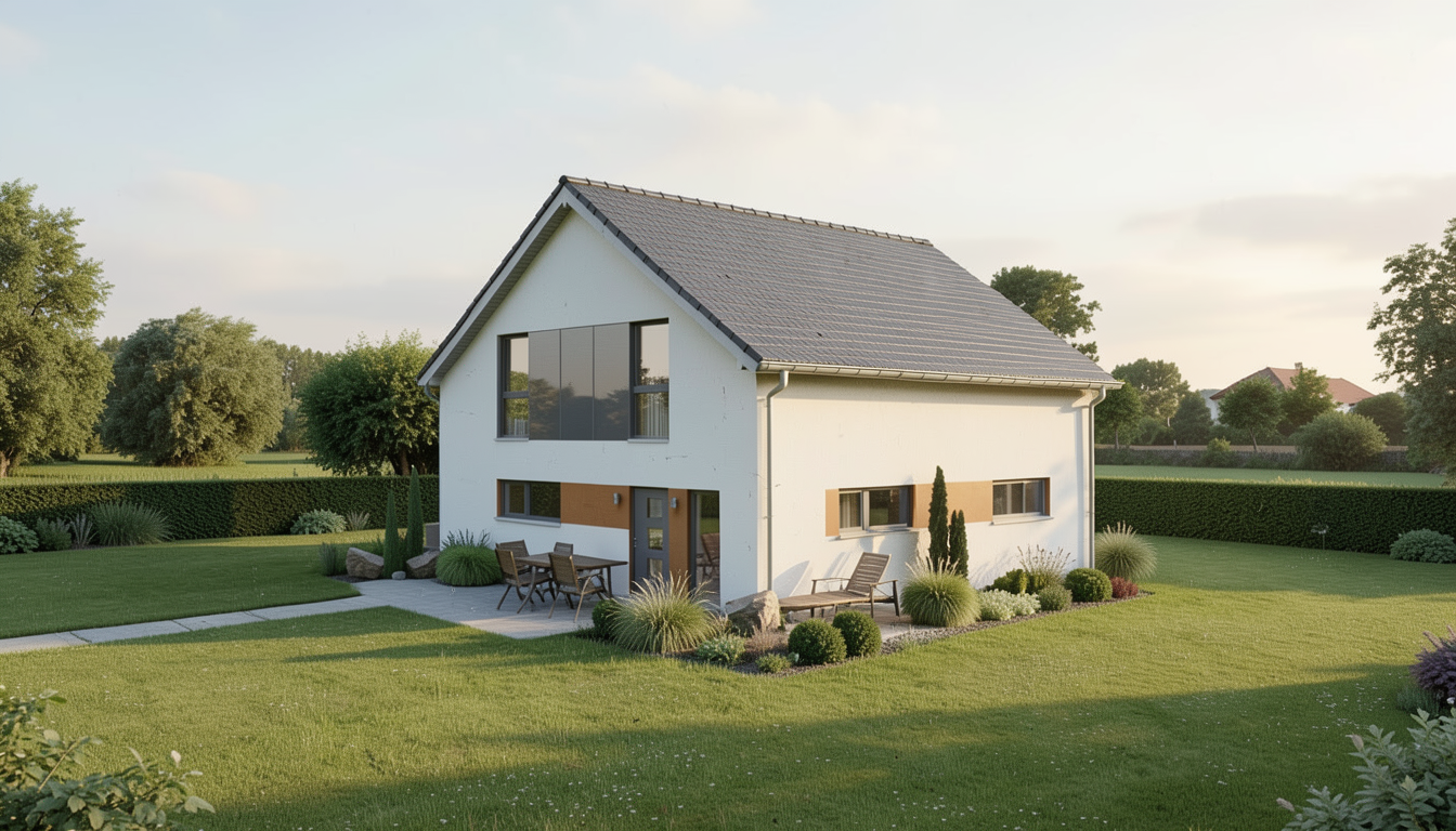 Das Haus besticht durch seine moderne, zeitgemäße Architektur mit heller Fassade und großzügig dimensionierten Fensterflächen. Der sorgfältig gestaltete Eingangsbereich und die klaren Linien verleihen dem Haus eine freundliche, einladende Ausstrahlung – ein Zuhause, das Wärme und Qualität ausstrahlt.